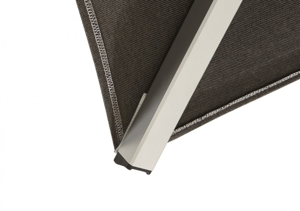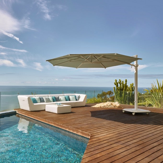 The giant freepoles of the JCP.4 series combine technical intelligence and top-quality materials with neat design and elegance. They are supported sideways by an elegant though heavy base. Also here, the transition from pole to base is invisible. The umbrella opens very easily with the crank handle. The position of the canopy can be easily blocked on any height.